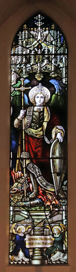 E2 (centre): St Michael (Cross, shield and dragon at his feet. "Praise Ye Him, All His Angels")