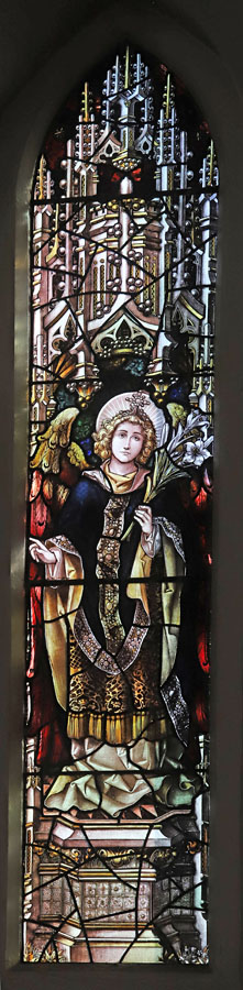 The three windows are a memorial to the late curate-in-charge at St Michael's, Rev. W. H. Kitson (died 5th June 1893),4 and were unveiled on the evening of 2nd January 1894. They were dedicated by the Rev H. C. Woodhead, a colleague of Rev Kitson at All Saints Clapton where he had been curate prior to taking up his post at Barnes. The windows were given by parishioners of St Michael's (Raphael), the Rev. Kitson's brother-in-law (Michael), and parishioners of All Saints, Clapton (St Gabriel).5
