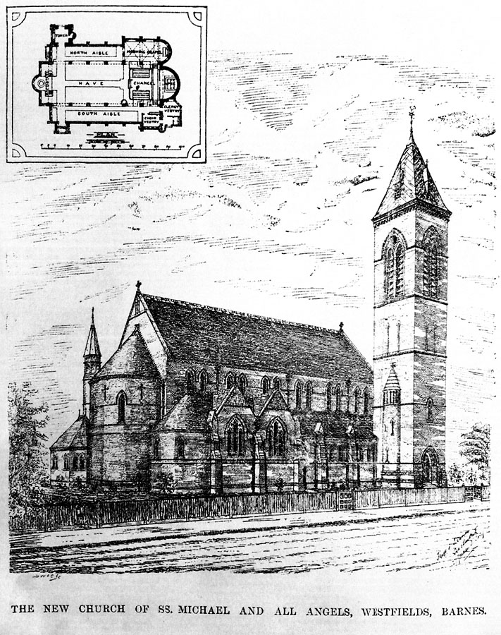 St Michael and All Angels was designed by the London Architect Charles Innes, FRIBA (1825-1907). Although his work was predominantly focused on commercial and high value residential property, Innes was a High Church Tractarian, and as a congregant at the Mission Church which preceded the present building, it was fitting that he be commissioned to replace it. He was churchwarden at St Michael's for many years. This is Innes's only complete church still standing. His earlier restoration projects in London at St Mildred's, Bread Street was destroyed by bombing in World War Two, and St Mary le Bow was gutted by fire and later completely restored. His work at nearby St Mary's, Barnes, was also destroyed by fire in 1978. He also remodelled Wren's church of St Mary, Aldermary, but this was also severely damaged during the blitz and it is not certain what, if any, of Innes's work remains.1