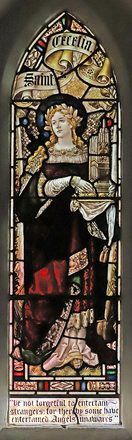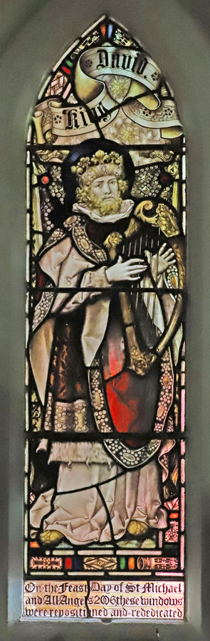 In 2006 a new door was inserted in the south aisle to permit access to the proposed community centre adjoining the church. Two windows in that location were removed, installed in the sacristy, and rededicated on the Feast Day of St Michael and All Angels (29 September) 2006 which is noted on a new inscription added to the King David window. Beneath the St Cecilia window the inscription reads: