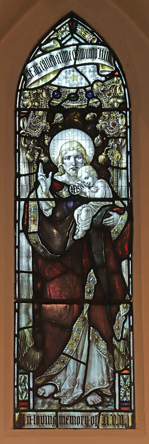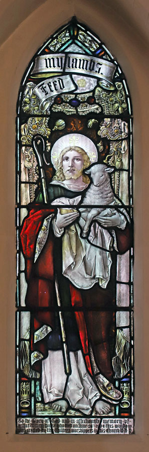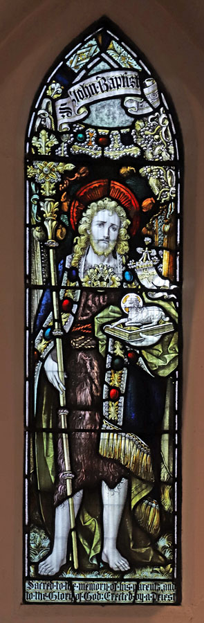 The scheme for the windows in the baptistery are well thought, representing the ritual of Christian baptism: a mother (St Elizabeth), a father (Zacharias), and their child (John the Baptist himself). These central figures are flanked by Christ holding a child, his hand raised in blessing, and Christ, the Good Shepherd holding a lamb and crook.