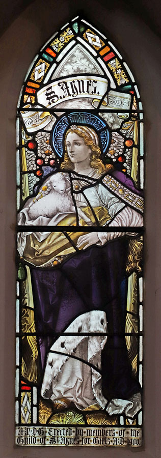 The St Agnes window was badly damaged, possibly during WW2. Plain glass was inserted as a "temporary" fix. This was eventually restored by The Cathedral Studios based at Canterbury Cathedral.2
