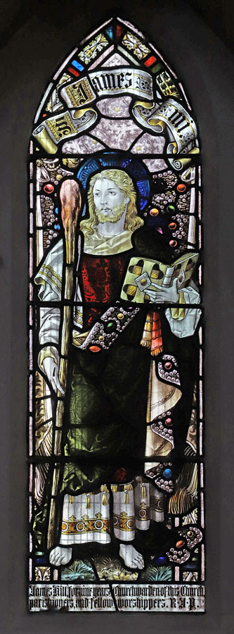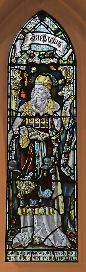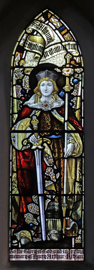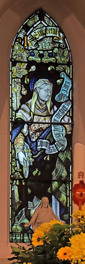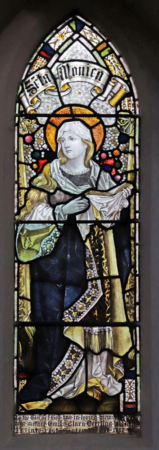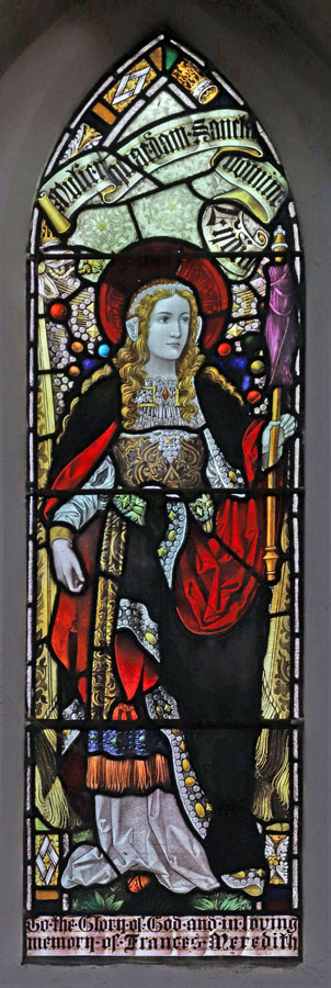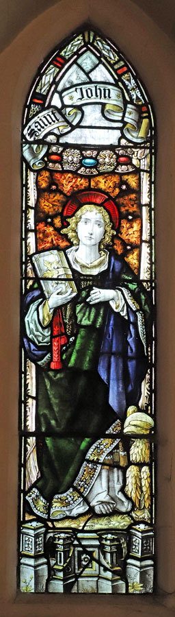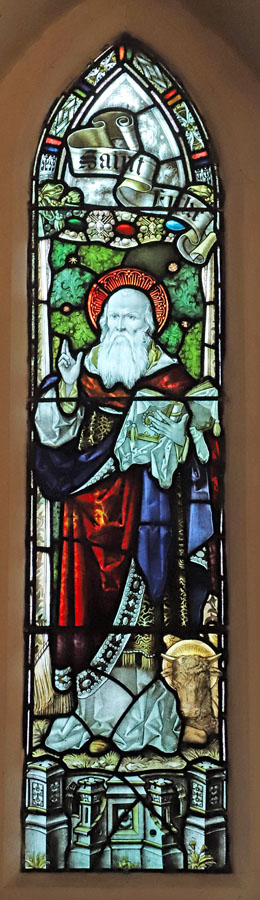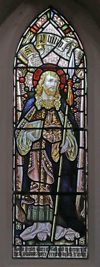 All the windows in the south aisle are single, small lancets which contain representations of saints. These were installed between 1899 and 1902. The treatment of each is similar; a standing figure with one of their attributes, and a scroll above to confirm identity. Each has a small dedication panel.
