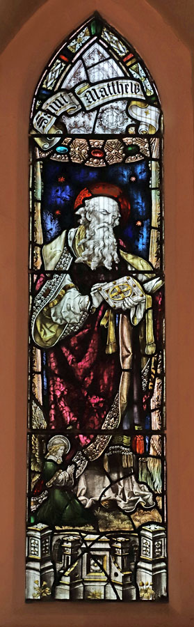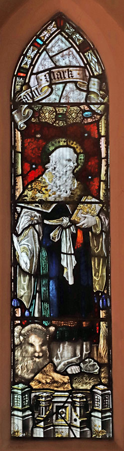 The two lancets at the west end of the south aisle have representations of the evangelists, Matthew and Mark. This is mirrored by the windows at the west end of the north aisle which has representations of Luke and John. Following the same style as other windows, each shows a figure with their attributes, standing in a simple "rustic" niche (the side columns painted as if wooden - a gentle touch), with identifying scrolls above. Both saints are depicted as old men, their symbols at their feet; a kneeling angel for Matthew, and a lion for Mark. The insertion dates for these windows has not been categorically confirmed. Robert Eberhard suggests 1899-1900.