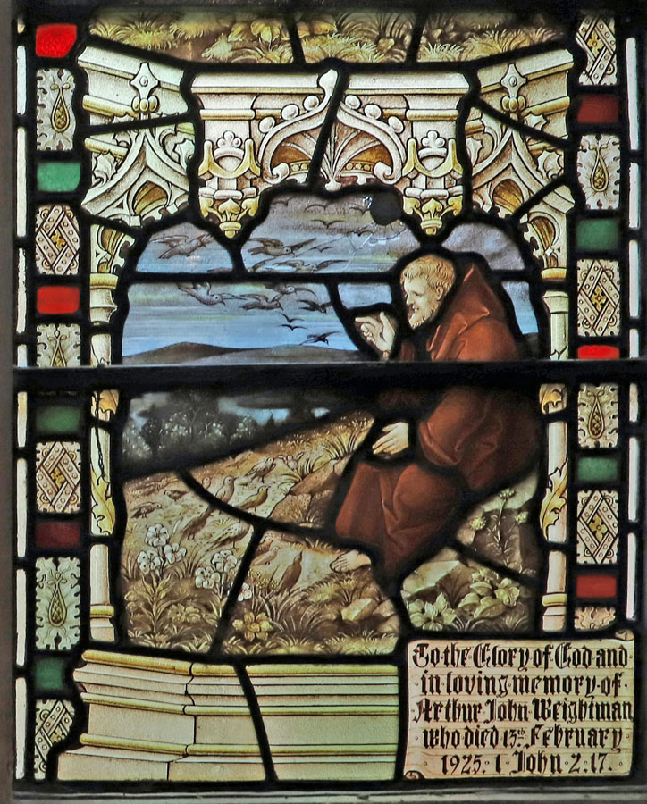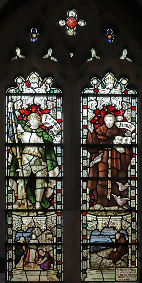 This window depicts St Joan of Arc and St Francis of Assisi. Beneath each saint a scene from their lives: