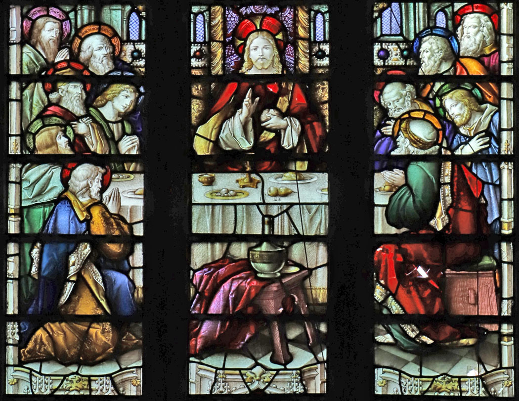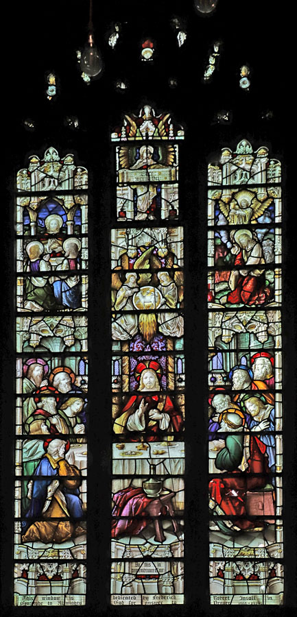 This three-light window by Percy Bacon Limited mirrors that in the north transept. It depicts as it's central theme, the last supper. At the top of the outer lights there are scenes depicting the Supper at Emmaus and Agony in the Garden. At the top of the central light an angel holds a scroll on which is written, "Ecce Agnes Dei" below which two more angels hold a shield emblazoned with the Lamb of God from which golden rays pour down towards Jesus. At the base of the central light, "Do this in remembrance of me".