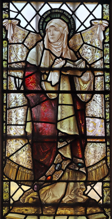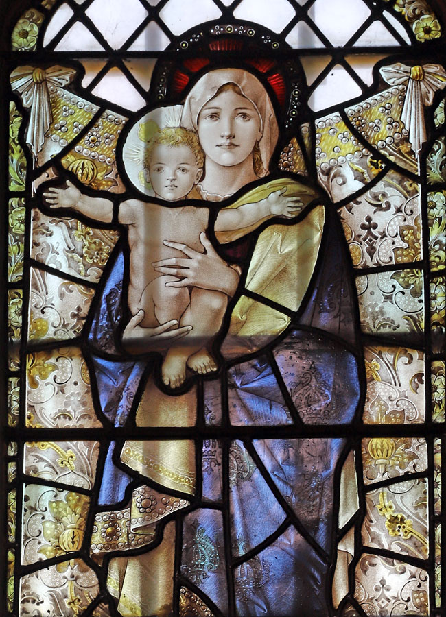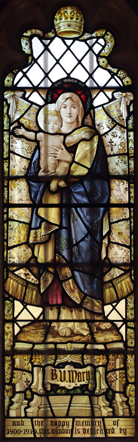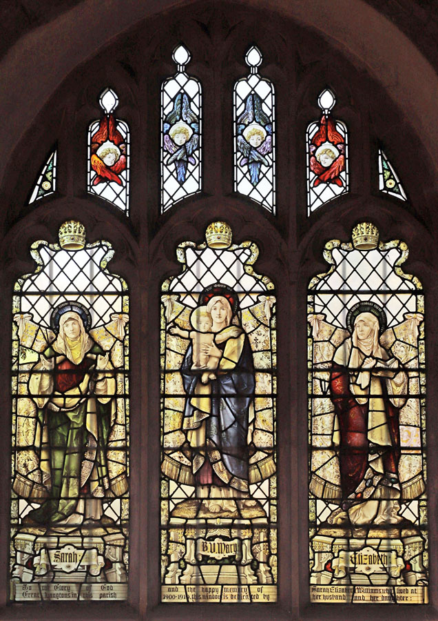There is a single Percy Bacon window in St Andrew's in the north aisle. It is a fine example of the quality of the painting work which was the hallmark of the studio, and was probably by Percy Bacon himself. The window, of three lights, depicts the standing figures of Sarah, the Blessed Virgin mary and Child, and St Elizabeth. The painting is exquisite, the skin tones almost porcelain-like in their delicate texturing. This is typical Bacon. The BVM stands central, and slightly higher than the other figures. She hold the Holy Infant with characteristic outstretched arms.