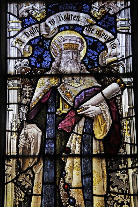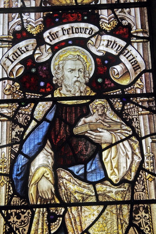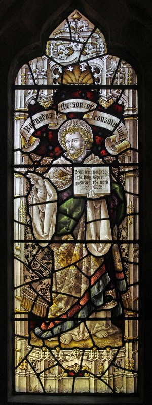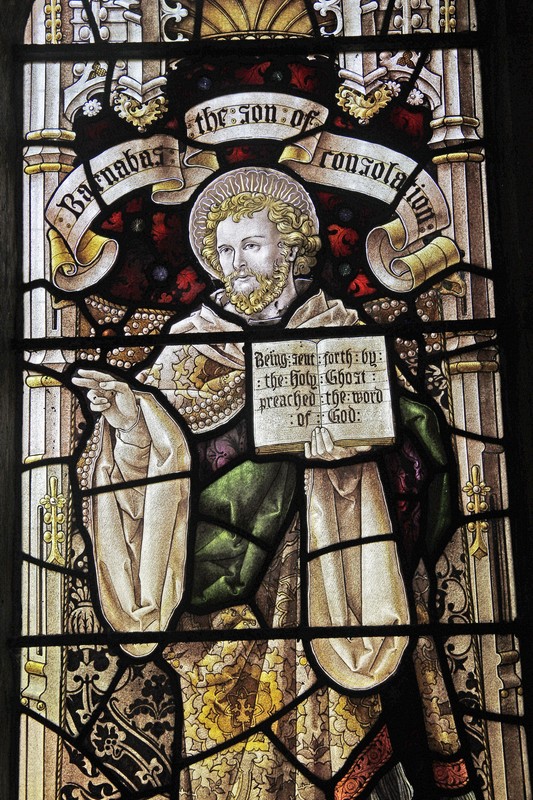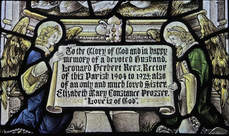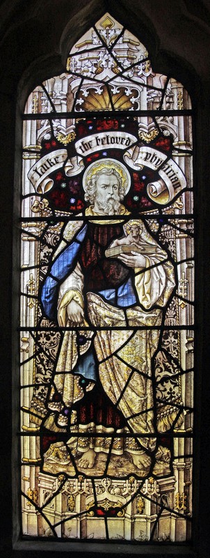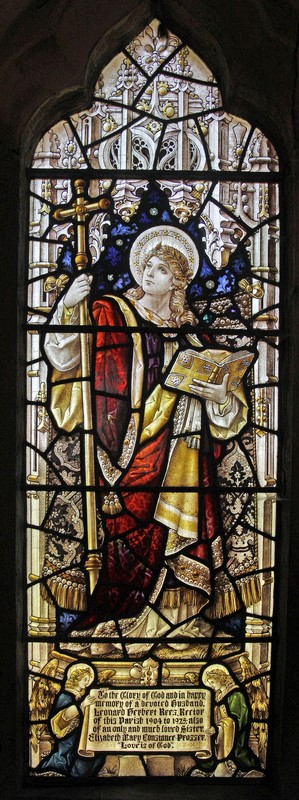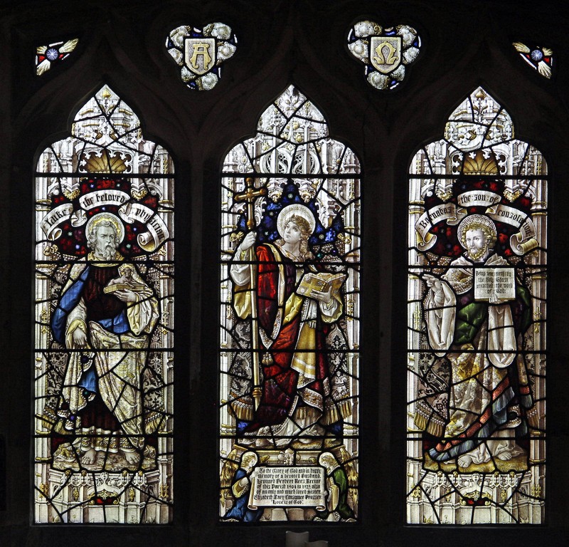NA3: Left: St Luke holding a book on which sits his emblem, an ox. Above him a scroll which reads, "S Luke the beloved physician". Centre: A haloed man carrying a brass crossed staff and holding a book, possibly representing Faith. Right: St Barnabas holding a book open at the words, "Being sent forth by the Holy Ghost preached the Word of God", and above him a scroll which reads, "Barnabas, the son of consolations". Above the figures in the tracery Alpha and Omega symbols. The window is dedicated to Leonard Herbert Rees, Rector of St Leonard's from 1904 to 1925.
