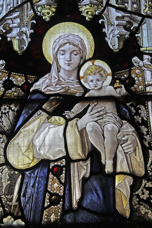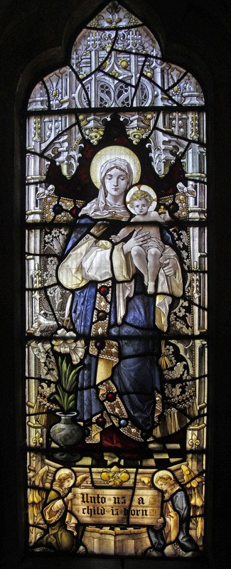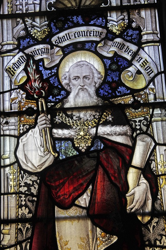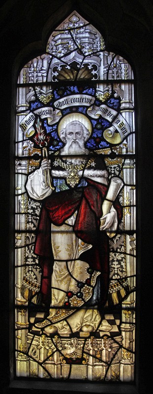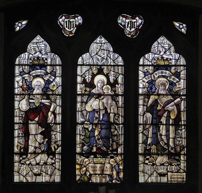 NA2: Left: In a reference to Isaiah 6;7; Isaiah holding a burning coal in tongs, the scroll above reading, "Behold a Virgin shall conceive and bear a son". Centre: Blessed Virgin Mary and child, a vase of lilies beside her, and "Unto us a child is born". Right: Jeremiah holding a scroll, the words above, "A light to lighten the Gentiles. Above the figures two IHS monograms.