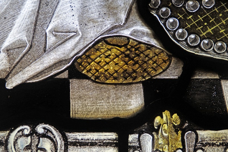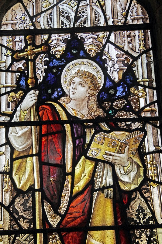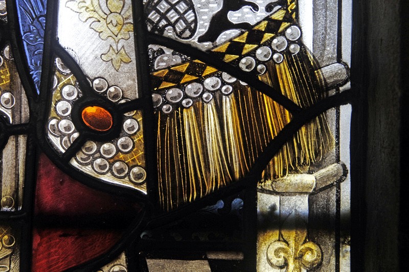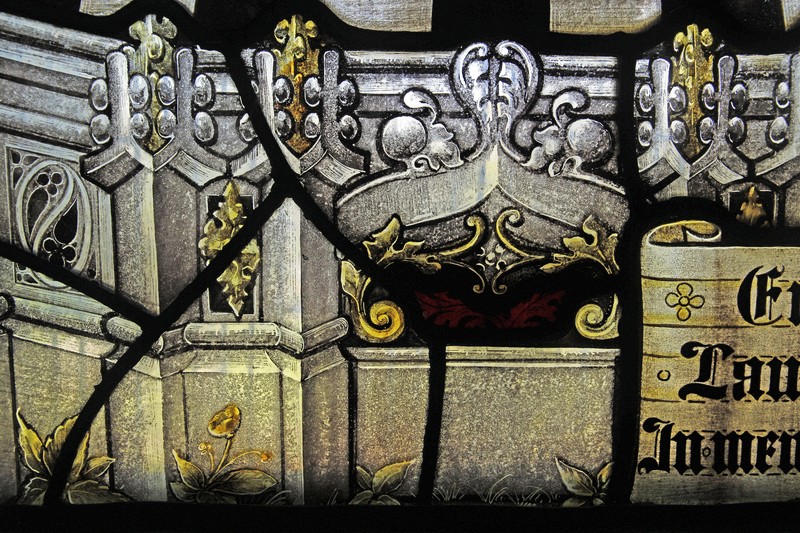 All the figures are dressed richly, their robes edged with pearls. They stand in front of jewel encrusted drapes tied with golden ribbons to the wide niche columns. In NA3, Faith's right elbow and Banabas's fingers extended in benediction slightly overlap the columns, as do the bottom corners of the drapes, giving the impression of the figures standing in front of the niches, rather than within. A similar technique is used in NA2. By contrast, Herbert Bryans (NA1) does not allow any part of his figures to overlap the columns, and his drapes are hung from hooks which appear to be behind the columns, thereby making them appear fully within the niches, and a little flat. Bacon's treatment is more pleasing to the eye, and results in a rather more realistic, three-dimensional representation. The canopies are rendered in paint on white glass with a little silver stain here and there, and the columns are wide, all allowing more light into the interior. The detail in the canopy work is impressive. Harmony is created with symmetry across the two windows, each of the centre lights trumping the outer ones with the elaborateness of the canopies. No detail seems to have been discarded or omitted; even the weeds growing at the base of the niches are accurately repeated over the two windows.