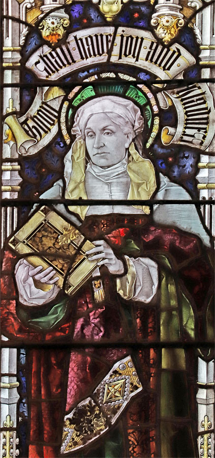 It is possible that the face of the saint is a likeness of the dedicatee, Elizabeth Mary Selby Gregson. Northumberland Archives holds the original watercolour by Percy Bacon created for the faculty.1