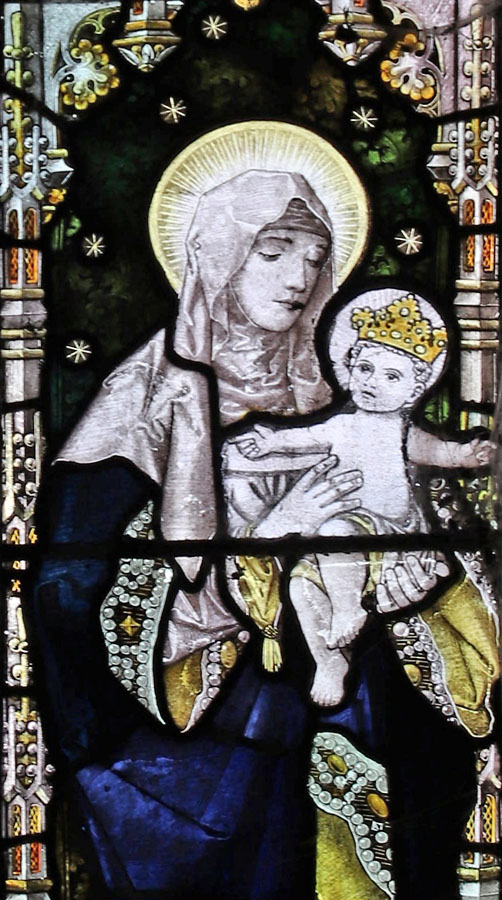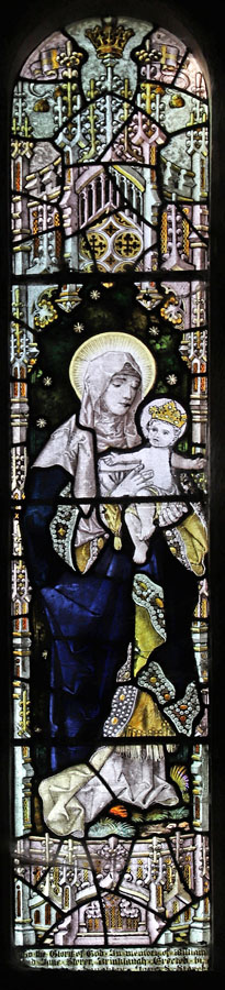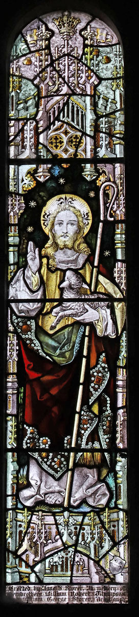 The two lancet in the west wall of the nave depict; on the south side, Jesus the Good Shepherd, and on the north, The Blessed Virgin and Child. These appear to be a pair, installed at the same time, both donated by Jane Sarah Storer (d. 1911) who is commemorated in the Bacon south nave window (see above). Only the south window is signed with the Bacon Shield. This dates the windows to between 1896 and 1898 during which period the shield was used until changing to the simple signature we see throughout the rest of the firm's existence..