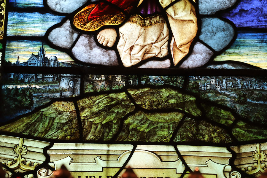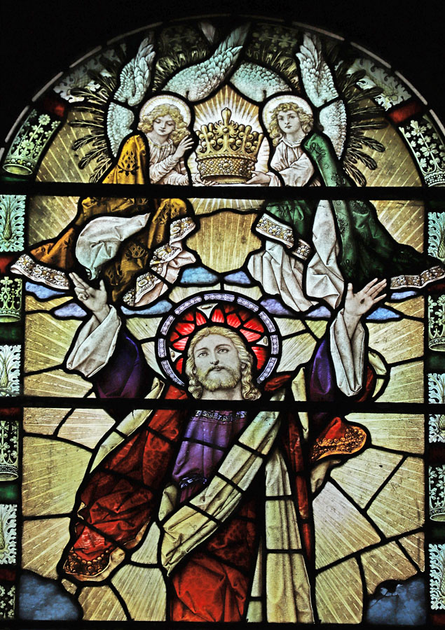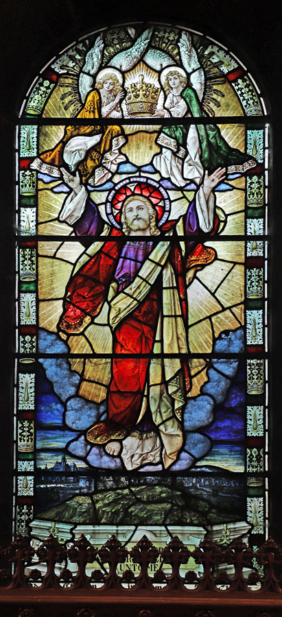 The east wall contains three round headed windows, the central one wider than the outer two which contain plain quarries. The central window by Percy Bacon represents the ascension of Christ and his coronation as King of Heaven and the beginning of his heavenly ministry. He is depicted rising from a grass knoll above an allegorical city through which two rivers run, the one on the left flows through an arch in the city walls, where a figure can be seen standing in the water, perhaps signifying the beginning of Jesus's earthly ministry. Above Him are two angels holding the crown. Beneath the figurative panel an inscription quoting John 12:23 reads: "I, IF I BE LIFTED UP WILL DRAW ALL MEN UNTO ME" [sic - the prefixed "and" seems to be missing].
