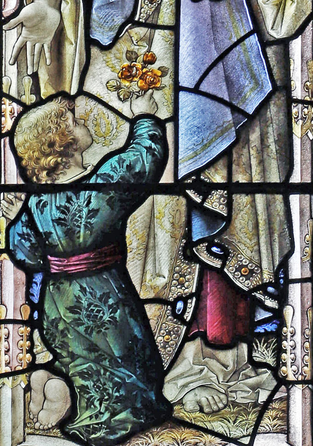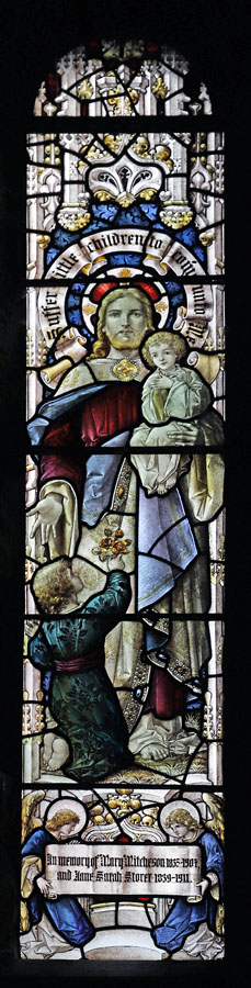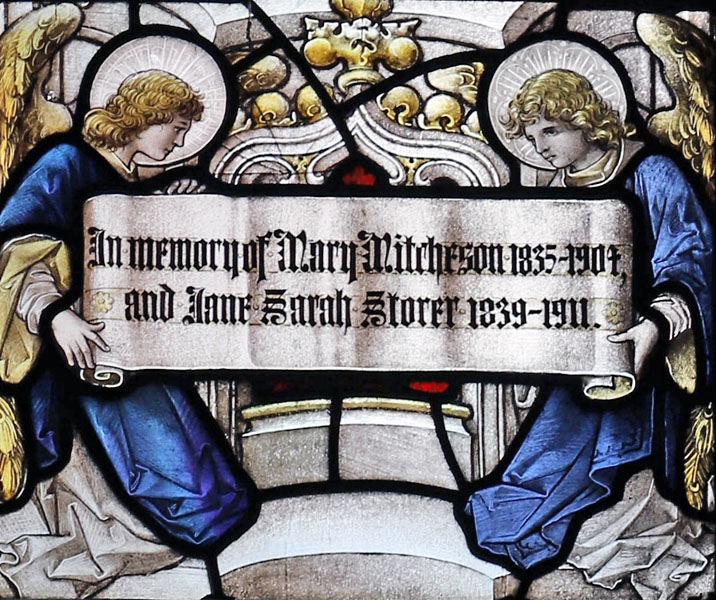 The window is dedicated to the memory of Mary Mitcheson 1835-1904 and Jane Sarah Storer 1935-1911. Jane was the daughter of William and Jane Storer who are commemorated in the window she donated on the north side of the west wall. The date of the window's execution is confirmed from the faculty papers held by Northumberland Archives which includes the original cartoon, approved by H. B. Hooper, Archdeacon of Lindisfarne, 27th July 1911.4