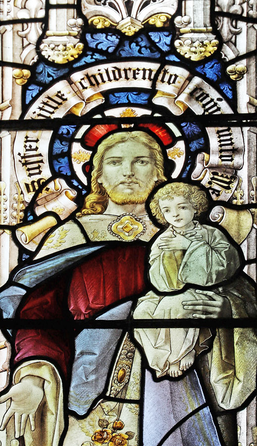 A simple round-headed window with deep internal splay depicts Jesus with little children. The banner above reads: "Suffer little children to come unto me".