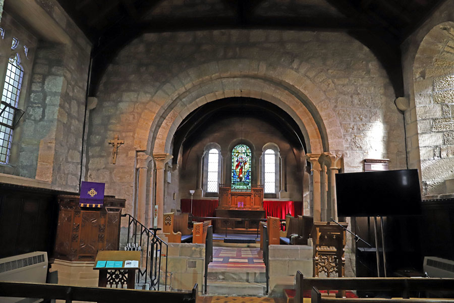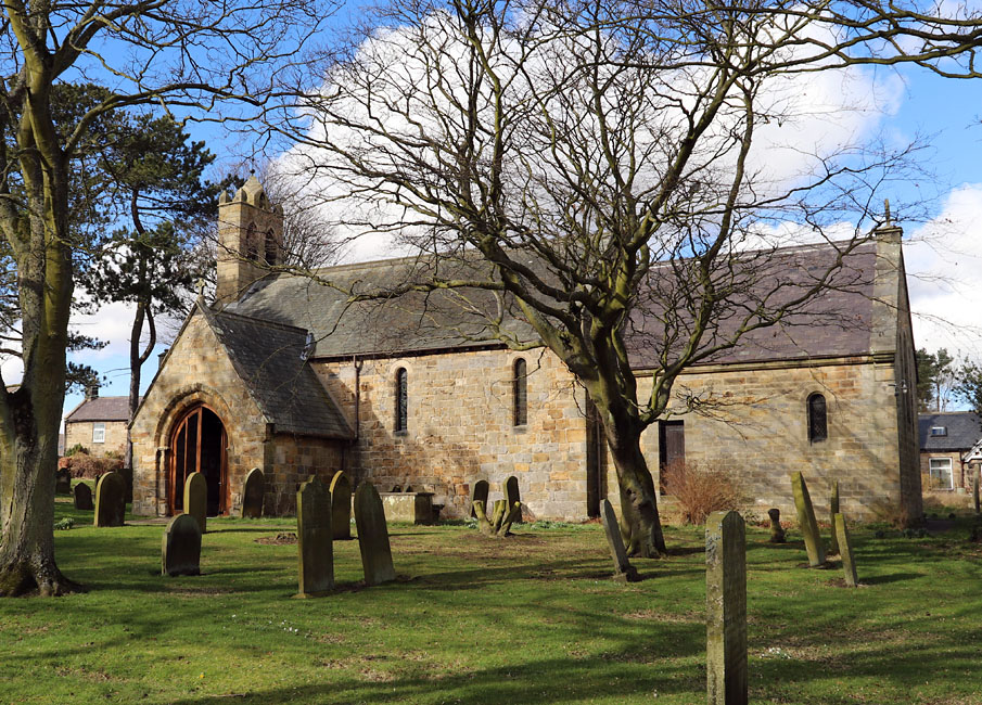 St Mary the Virgin was built around 1190, probably on the site of an earlier Saxon church. The deeply splayed round-headed lancet windows on the south side, and the splendid chancel arch supported on each side by three detached columns and carved capitals attests to its Romanesque heritage. The west wall which contains two lancets filled with Bacon Studios glass are separated by an external buttress, probably installed around 1740 at the time the double bellcote was added. It is thought this blocks the original west door.1 The church was restored in 1896 by Hicks and Charlewood of Newcastle.2