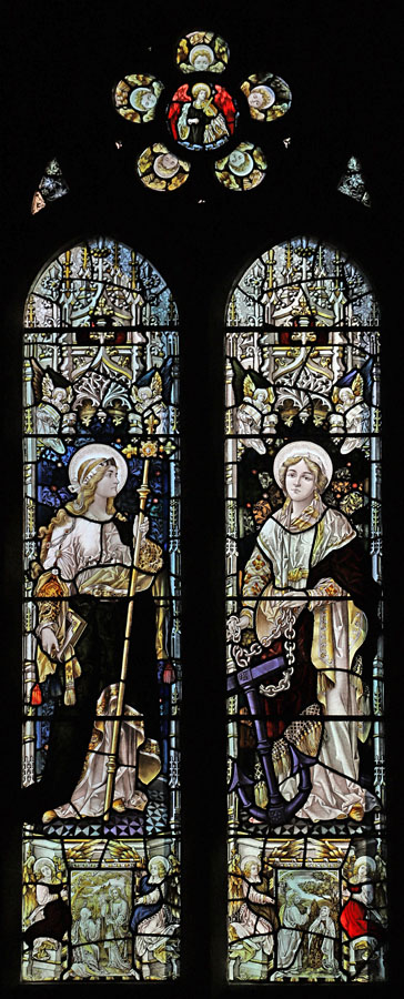 Within classic Bacon style ornate architectonic niches of white glass and yellow stain stand the figures of (SC2) Faith and Hope, and (SC3) two unidentified allegorical figures. In the heads of each niche demi-angels look on. They hold blank scrolls, which may have been intended to contain a message which was never written. In the tracery copying the style of the other windows in the chancel is an angel playing instruments surrounded by putti.