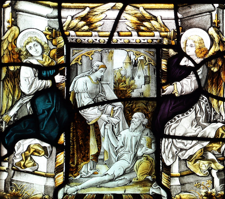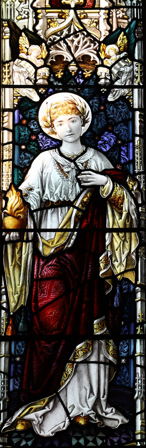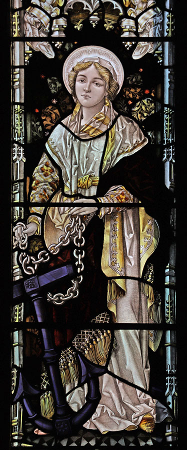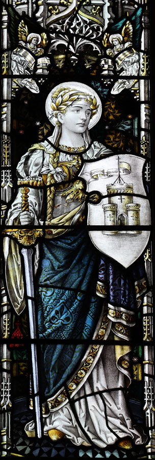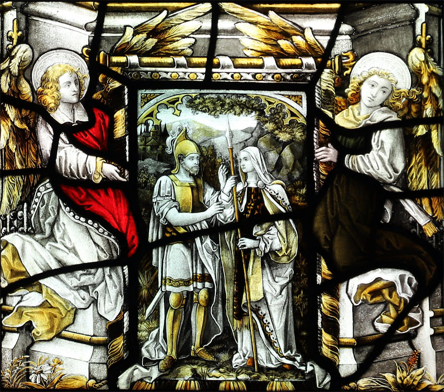 SC3: The left figure is androgynous and rather young looking. They are dressed in a white robe with red cloak and wear the crown of victory. They hold a flaming heart in their right hand, traditionally a symbol of God's boundless and passionate love for mankind. In the right light is the figure of a woman holding a sword in her right hand, and a shield in her left, possibly representing the virtue of spiritual strength. On the shield is the image of a fort flying a banner which reads, "turris fortissima ma nomen dei" (the strongest fort is the name of God"). In the predella, copying the style of those in SC2, are two more narrative scenes. The left seems to depict an act of corporal mercy (clothe the naked). The right depicts a Roman soldier in full armour standing next to a woman who holds his spear. Quite what this refers to is moot, but this might represent the strenth of women.