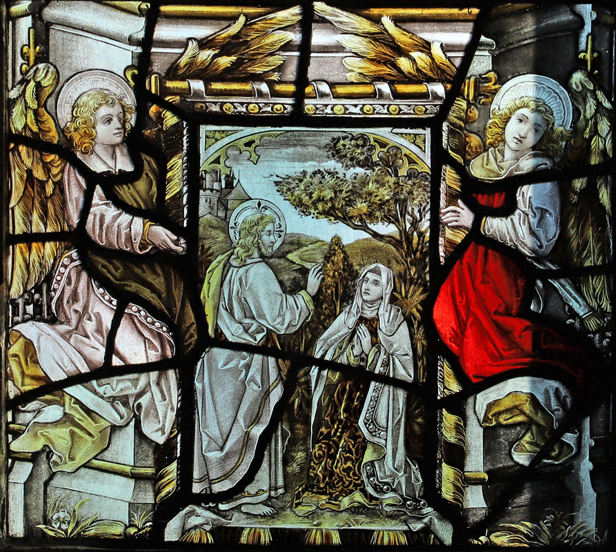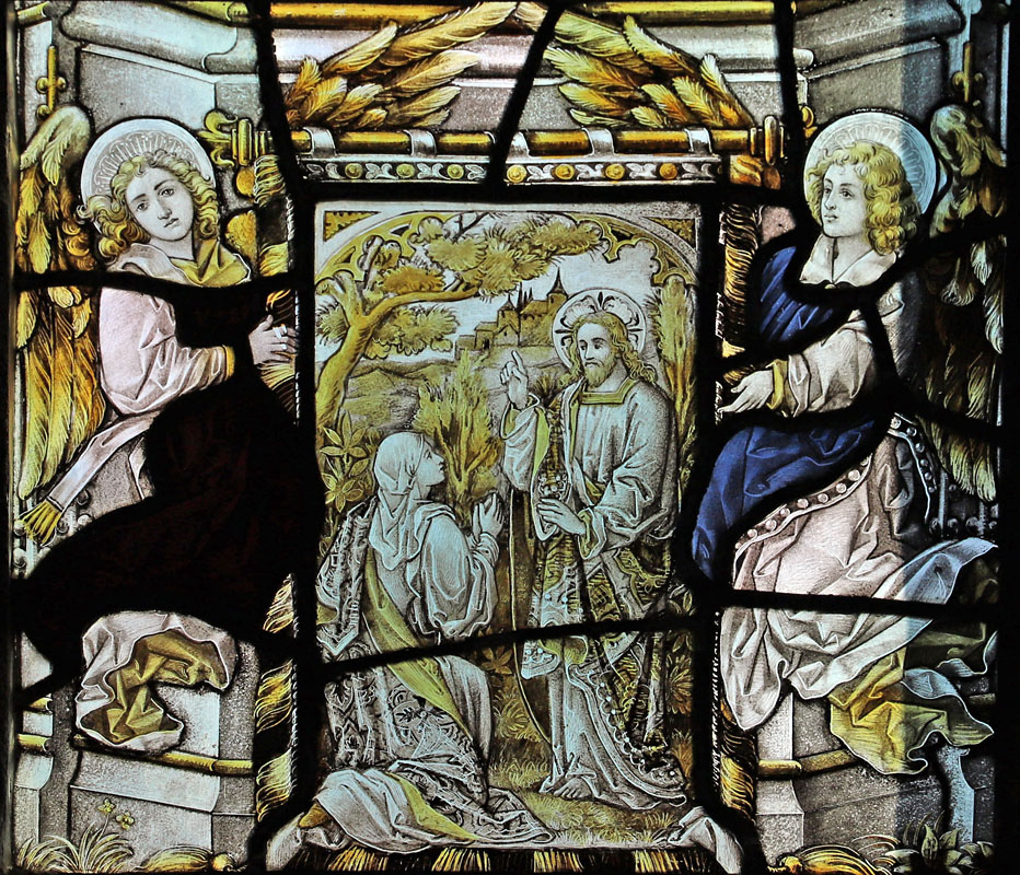SC2: The figures are the virtues of Faith and Hope, each carrying their respective symbols of cross and anchor. Beneath the figures in each predella angels hold a picture on which a narrative scene is painted in yellow stain. Both show the standing figure of Christ before a kneeling un-haloed woman with hands clasped as if beseeching or in prayer. Christ's hand raised is as if in blessing, or perhaps as a calming gesture.