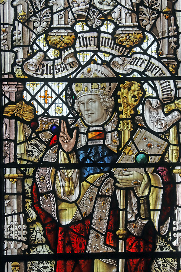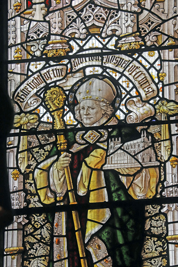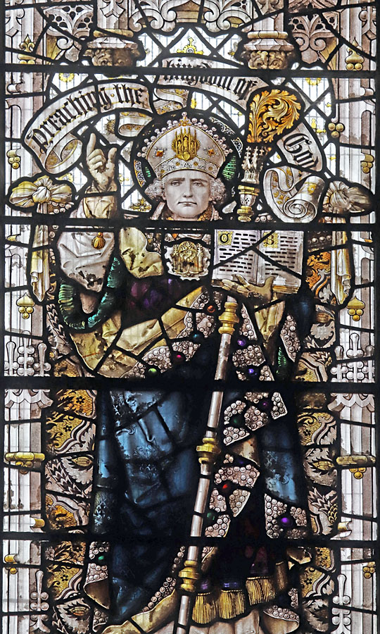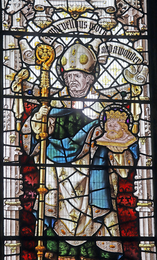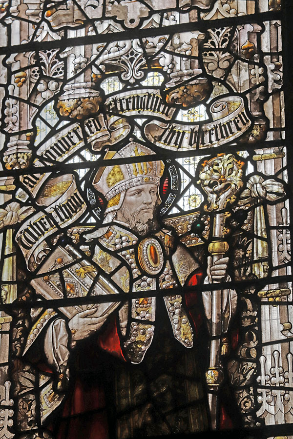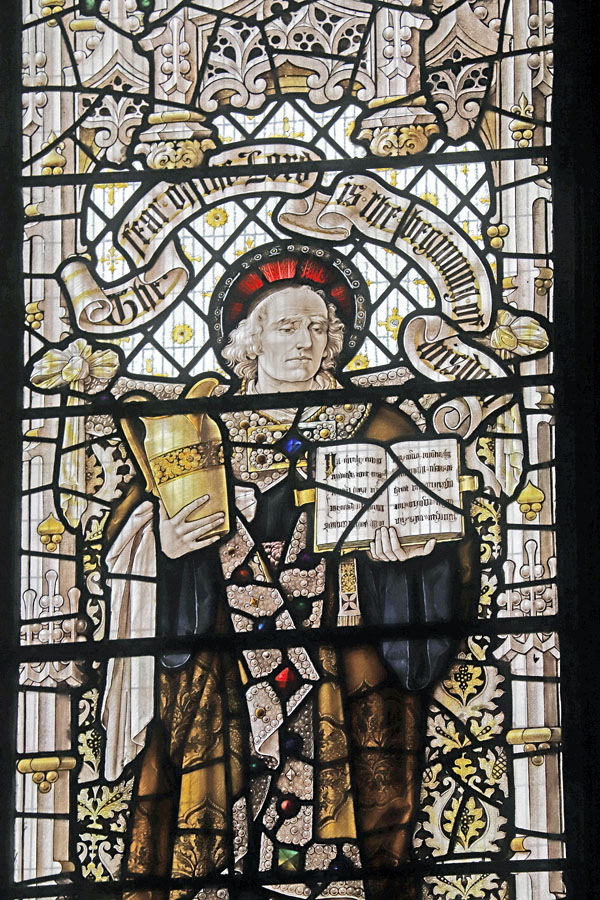 The Perpendicular window of five tall lights with tracery depicts the figures of ten English Saints, mostly from the midlands and north. Each figure is framed within its own niche, standing in front of a bejewelled rug tide to the side columns. Over each figure a scroll unfurls with scriptural text. These are, from left to right starting with the top row: