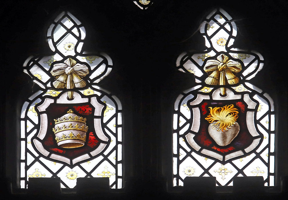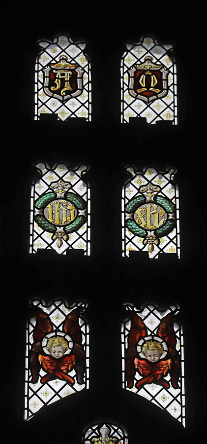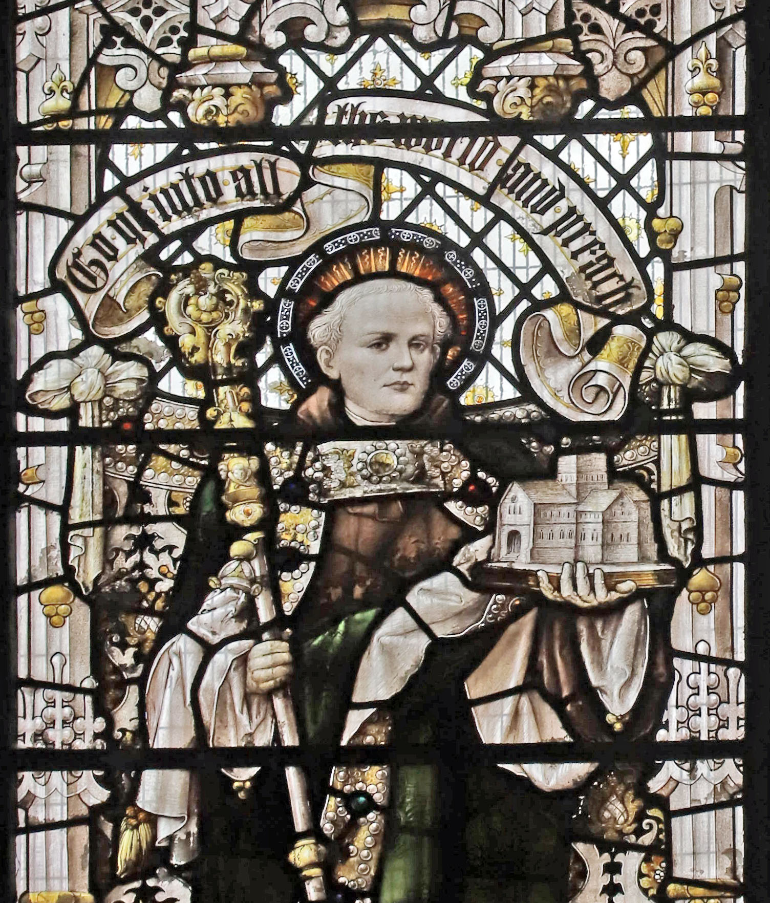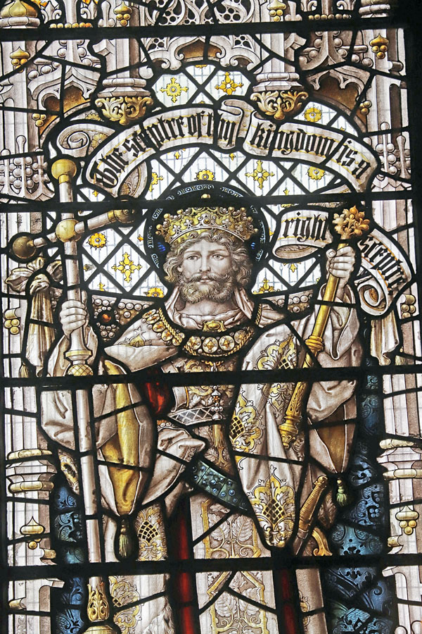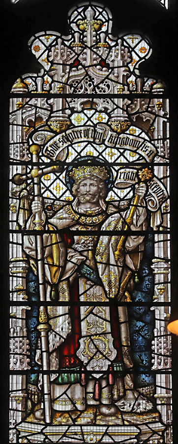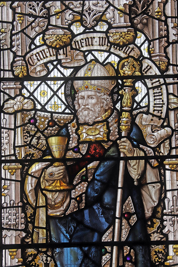 The Perpendicular window of five tall lights with tracery depicts the figures of ten English Saints, mostly from the midlands and north. Each figure is framed within its own niche, standing in front of a bejewelled rug tide to the side columns. Over each figure a scroll unfurls with scriptural text. These are, from left to right starting with the top row:
