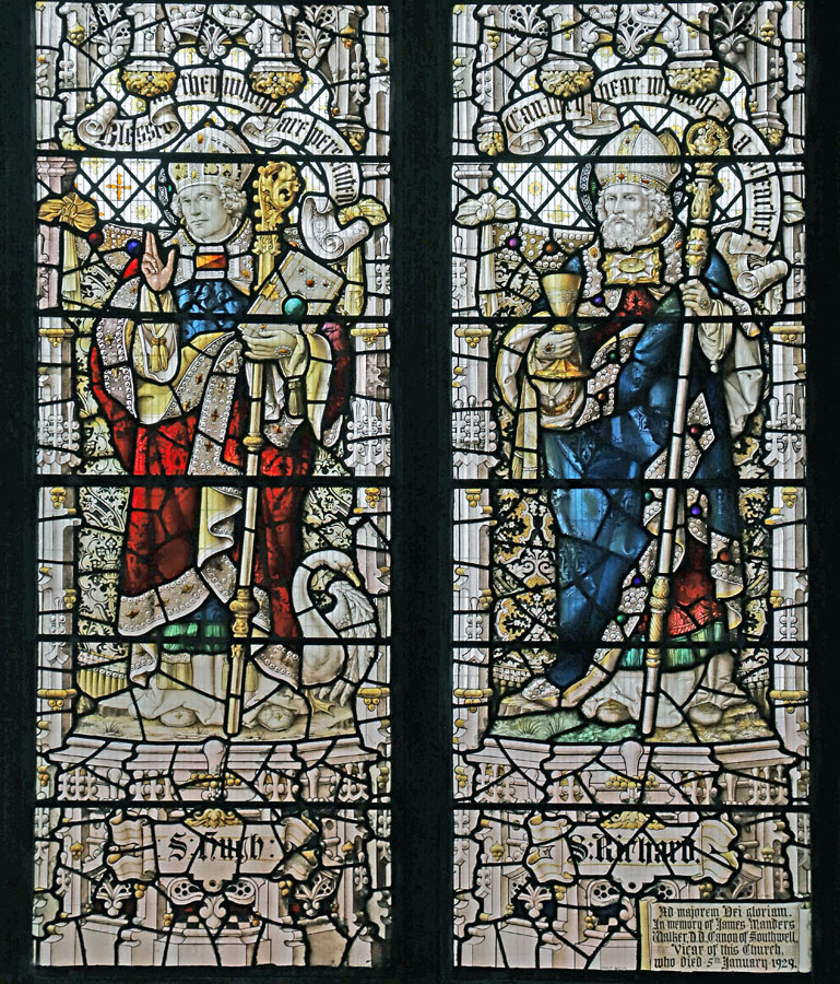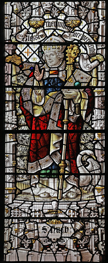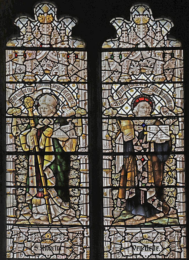 All except Oswald, Columba and the Venerable Bede are depicted as Bishops with their respective symbols or attributes, or holding a model of the churches they founded. Cuthbert, as Bishop of Lindisfarne holds a book on which the severed head of King Oswald rests; Hugh, as Bishop of Lincoln has a swan at his feet; Richard, a chalice, representing the one he dropped during mass and which spilled not a drop; Aidan stands by his reclining stag.