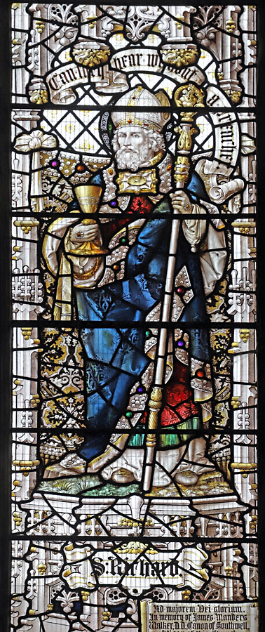 The window is dedicated to the Rev. James Manders Walker, D.D. Canon of Southwell, and vicar of St Mary Magdalene from 1919 to 1929, who died 5th January 1929. The Rev Walker donated two windows by Percy Bacon, at St Euny's, Redruth, Cornwall, and St Peter's, Tempsford, Bedfordshire.
