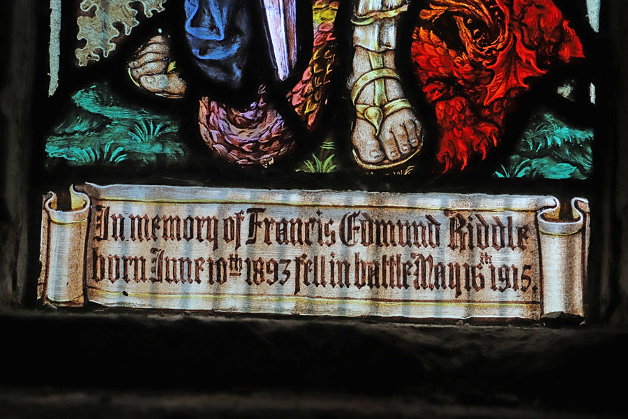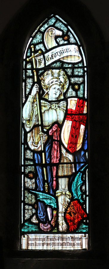 There is a single window by Percy Bacon and Brothers, a small lancet set in a deeply splayed opening on the south side of the chancel. It is a memorial to 2nd Lieutenant Francis Edmund Riddle, the rector's son, who served with The 2nd Battalion Oxfordshire and Buckingham Light Infantry, from his enlistment in October 1913 to his death at the Battle of Festubert. Richebourg l' Avoue France on 16th May 1915.1 The inscription reads: