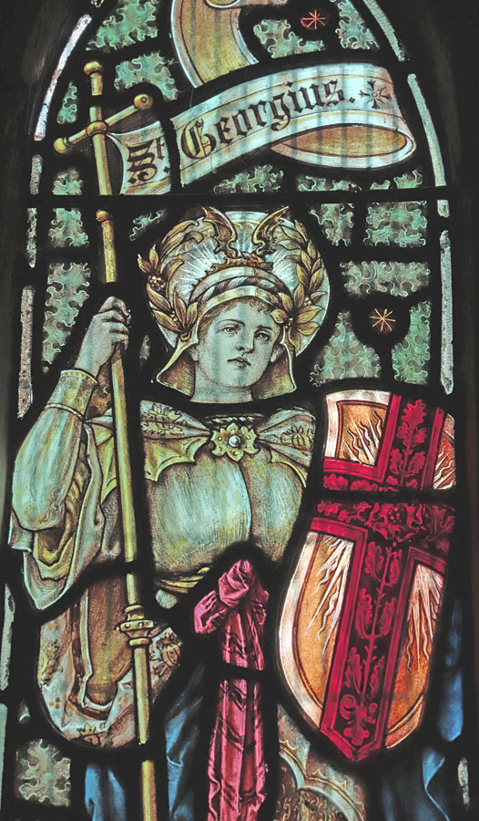The window represents the figure of St George defeating the dragon. However, it is not of Percy Bacon's usual standard of figurative painting, and is clearly by another's hand. This is explained by the reporting of the dedication ceremony on 2nd September 1917:2