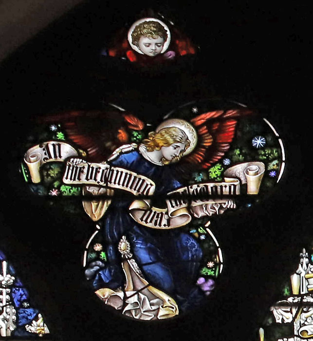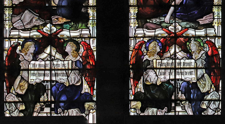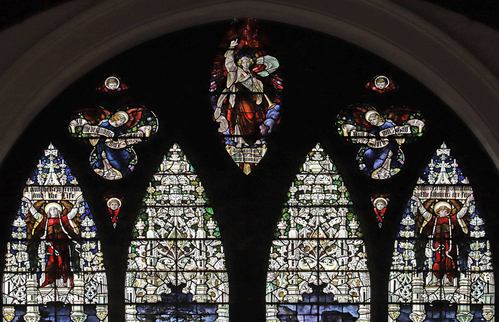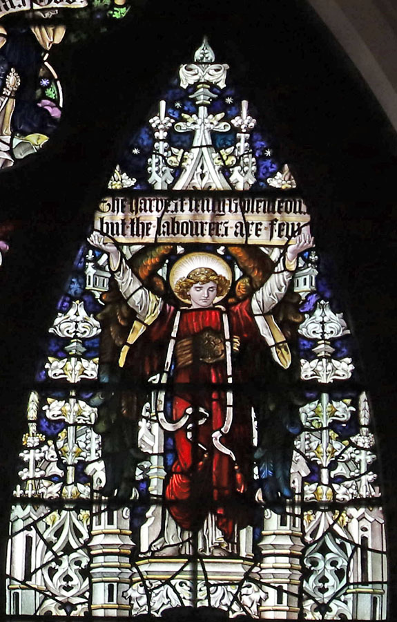 Tracery lights: Angels in the canopies hold scrolls: Left: "I am the Resurrection and the Life". Right: The harvest truly is plentiful, But the labourers are few.