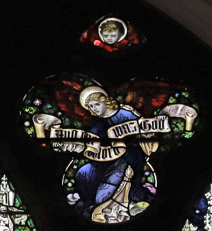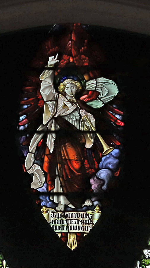The angels in the upper tracery hold scrolls: Left: In the beginning was the word. Right: And the word was [with?] God. Beneath the central angel: The Word was made flesh, and dwelt among us.