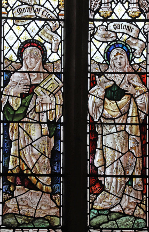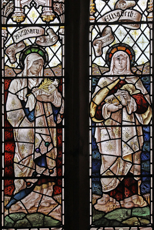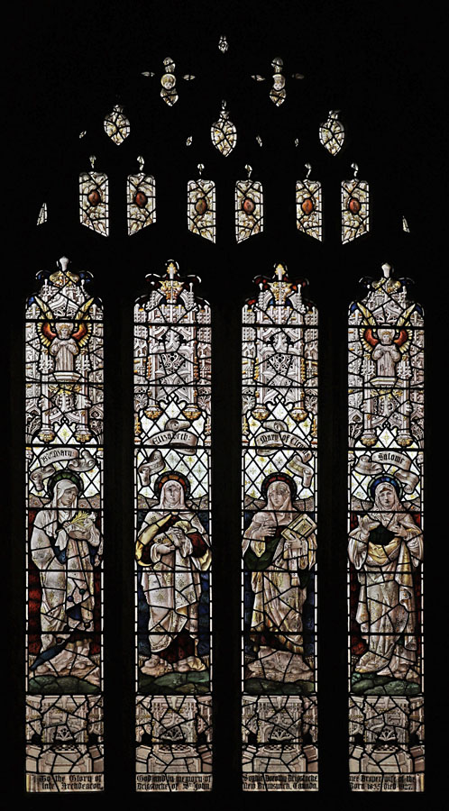 The window is physically identical to its neighbour (see below) and those in the chancel. As is mentioned in the descriptions of those other windows, the architectonic devices and tracery lights use the same design. This window depicts the four principle Mothers of the New Testament; The Blessed Virgin Mary, Elizabeth, Mary of Cleopas, and Salome.