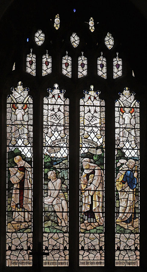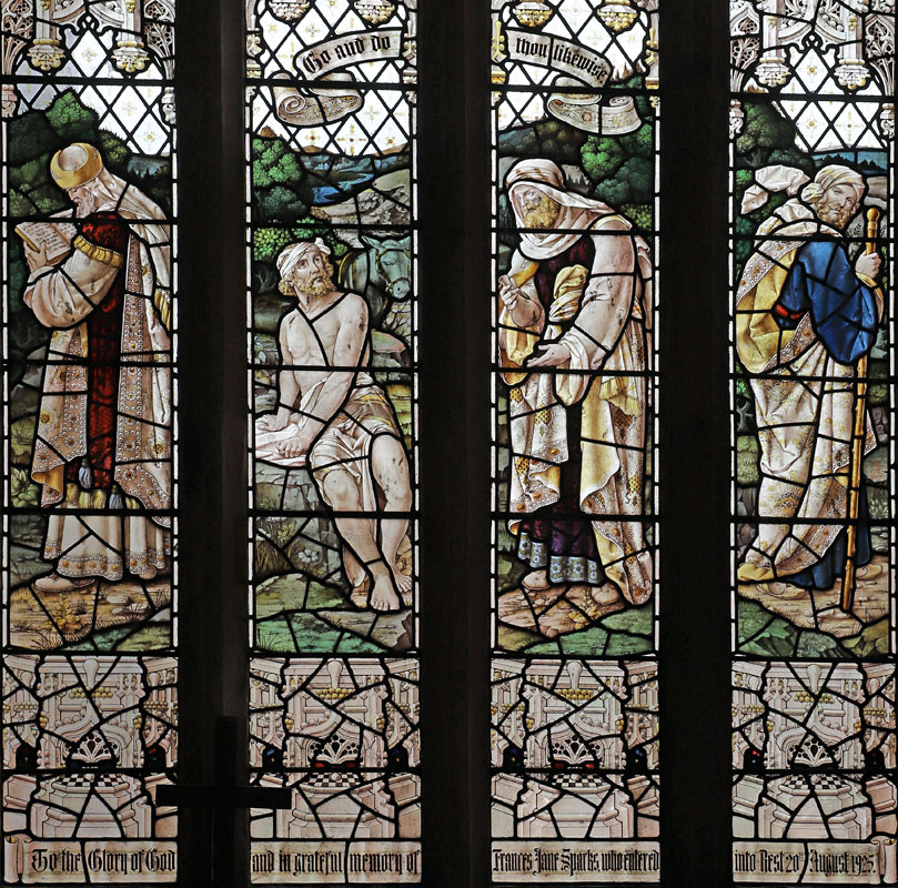 The story of the Good Samaritan is laid out over the four lights. In the outer lights the priest and Levite are seen sculking away, ignoring the injured man. In the central two lights the Samaritan tends to the injured man, while above them the scroll reads, "Go and do likewise". The subject is said to have been chosen to reflect the kindness of Miss Sparks character, and her generosity towards those in need.