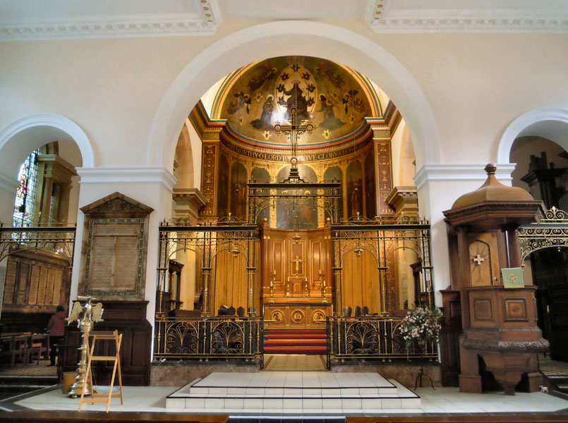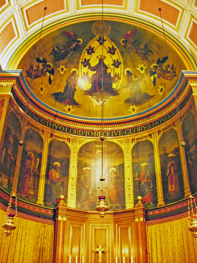 During its first ten years or so in business Percy Bacon & Brothers carried out a significant amount of general church decoration. At Holy Trinity the dome above the sanctuary represents Christ in Majesty surrounded by flying angels and putti, and two kneeling saints; the the right, St John the Baptist, and to the left, the Blessed Virgin. Floating around Christ are more putti, while above Him is a representation of the Holy Spirit.