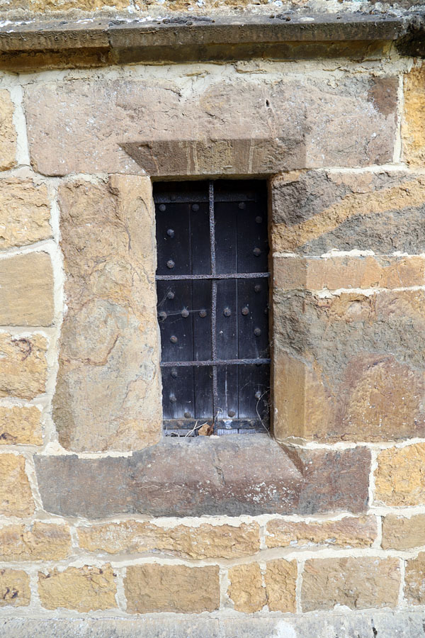 St Peter & St Paul;, Deddington, Oxfordshire. External detail. Note iron bars and wooden shutter in situ.