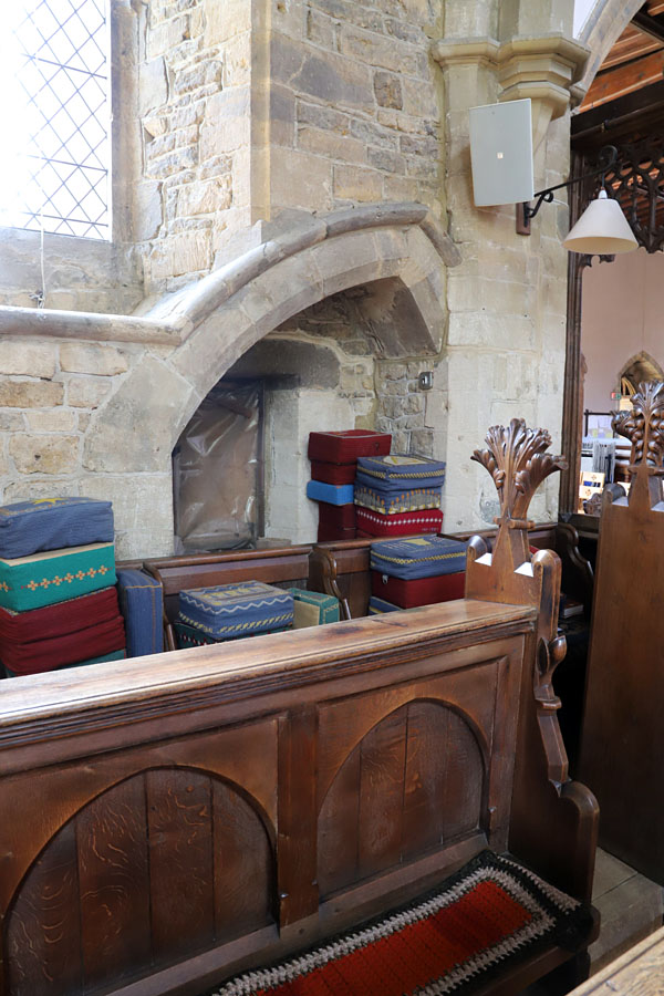 St Peter & St Paul;, Deddington, Oxfordshire. Internal view. The opening is deeply recessed under an asymmetric pointed arch which is curtailed on its west side by the respond of the chancel arch.