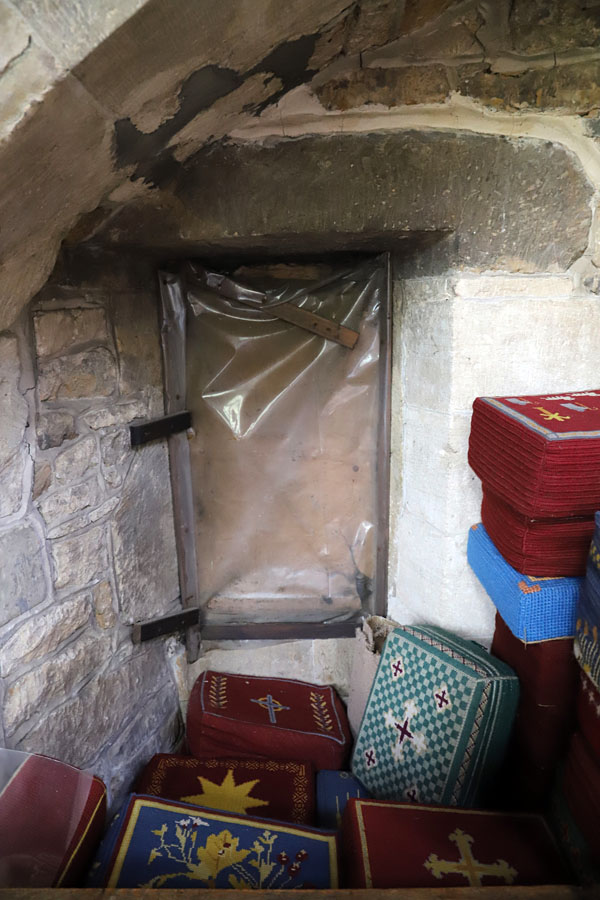Internal detail. The original splay has been lowered, but only extended across the westernmost light sufficient to accommodate the new opening. The splay has not been lowered enough to create a seat at a suitable height for a confessor, so it is assumed he would have perched himself on a wooden stool (as likely as not did the penitent outside). A slab has been placed above the new opening at the level of the original window's sill. There are no traces of any hinges, and the low opening rebate seems to have been obliterated by plaster.