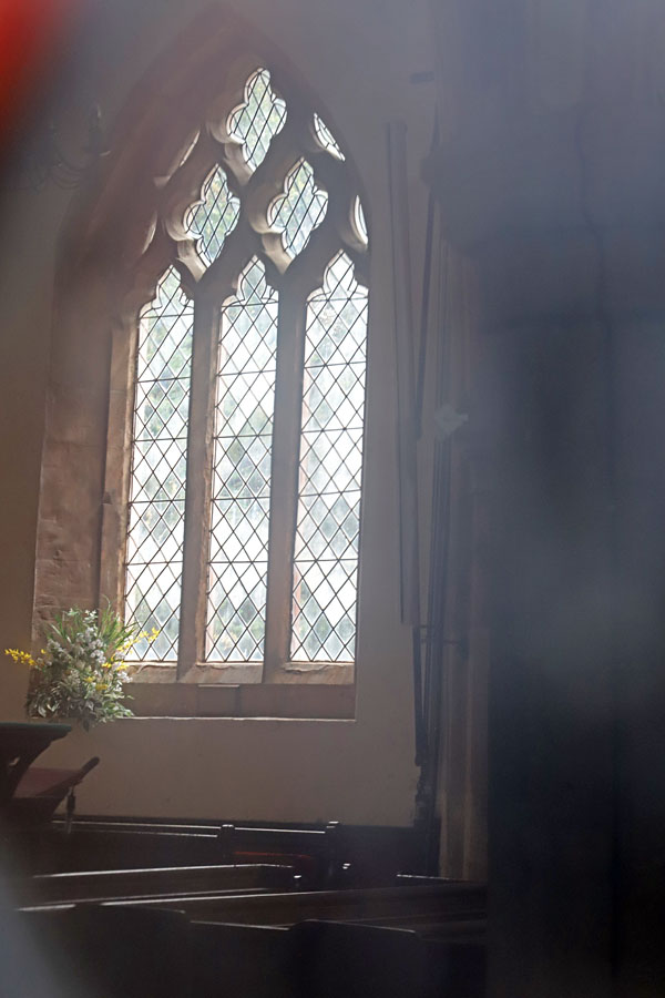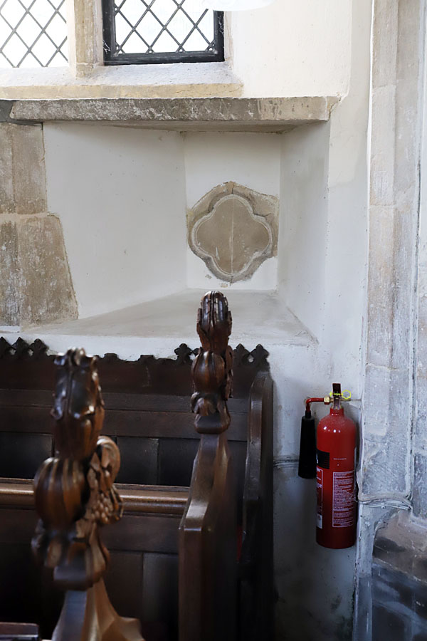 Most of what we see at St Margarets is c14 and c15, though some of its late c12 is still evident (see here). Restored by R. C. Hussey in 1840.1 Further major renovations were carried out in 2011.2 The chancel has four large Dec windows, two on each side, and an even larger east window of similar age. These are all high in the wall, and although the south western window is close to the west end of the chancel it is still too high to function as a confessional window. Here the solution was to install a circular aperture carved from a roughly square block of sandstone, and placed under the earlier window's sill. All trace of the aperture internally is now lost behind high choir stall backs.