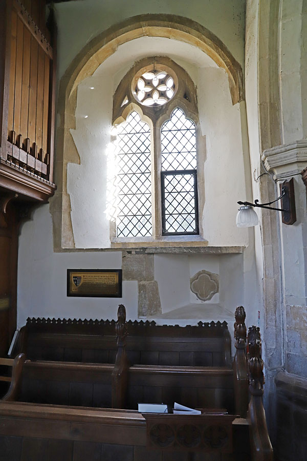 Traces of the Norman church can still be seen in the slit windows on both sides of the nave, and blocked north door. The chancel was built c1300, and has rather unusual tracery in its windows.1, 2 All the chancel windows are too high to have functioned as confessional windows, but the westernmost on both north and south sides are close to the western end. An independent opening was introduced below the south-west window; a pretty quatrefoil carved from a single block of stone which has been set in a shamfered stone surround, much like St Mary's, Essendine, Rutland (see p9). Internally the original window splay on the west side has been lowered, and is only carried across the westernmost light sufficient to accommodated the new opening (see next slides).