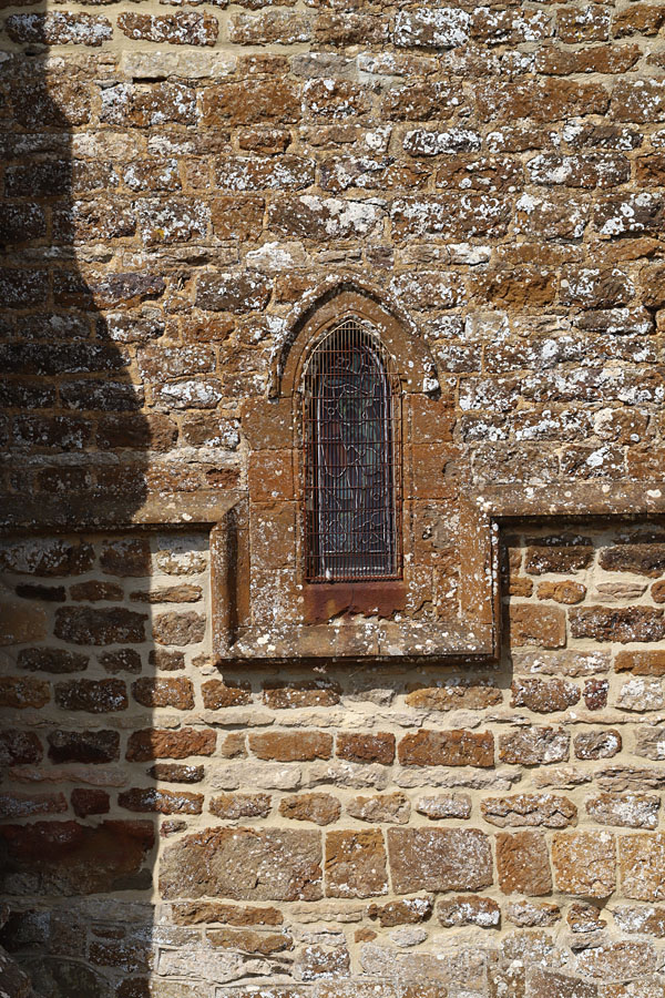 The low side window at St Mary the Virgin, Weekley, Northamptonshire. At the time this image was taken, the window was partially hidden by a bush.