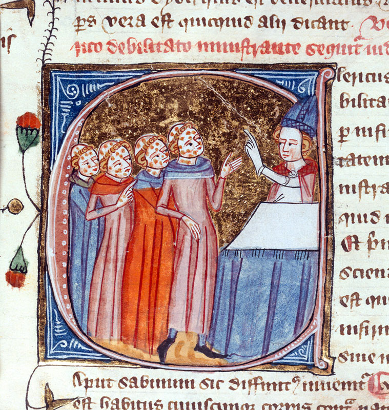 Clerics with leprosy receiving instruction from a bishop.