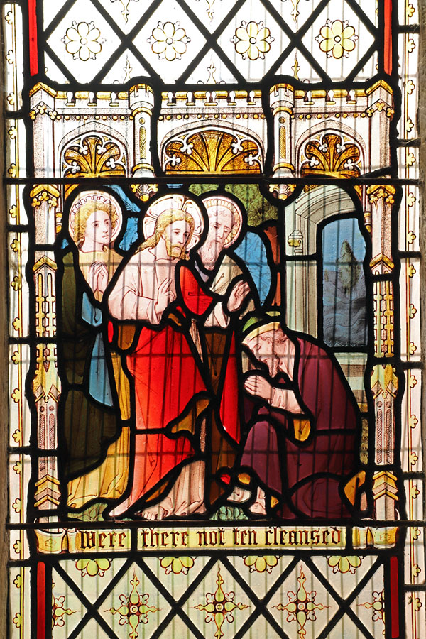 St Mary, Braughing, Hertfordshire; The low side window in the south of the chancel has been glazed with a scene of Jesus healing a leper which persists in the popular imagination.