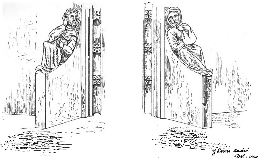 Sandridge, Hertfordshire. Sketch of the carved bench ends next to the chancel arch depicting a priest and a woman said to be giving confession; from J. L. André; Medieval Confessionals in England; The Reliquary, January 1884, p129