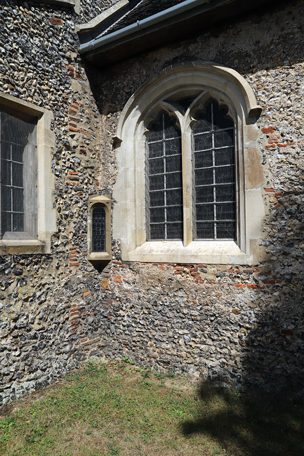 Holy Trinity, Scoulton, Norfolk. On the south side of the chancel a low side window has been installed directly below the original sill of the westernmost light.