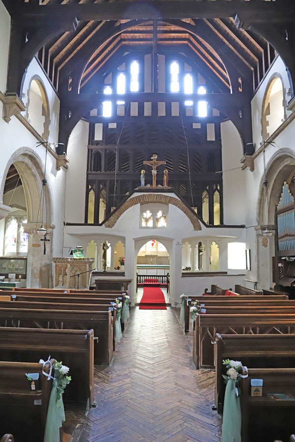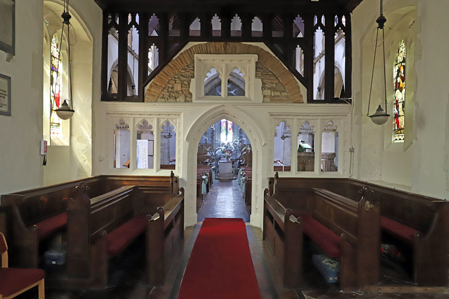 St Leonard's Church, Sandridge, Hertfordshire. The stone rood screen. The curious opening at the corner of the chancel and south aisle can be seen on the right.