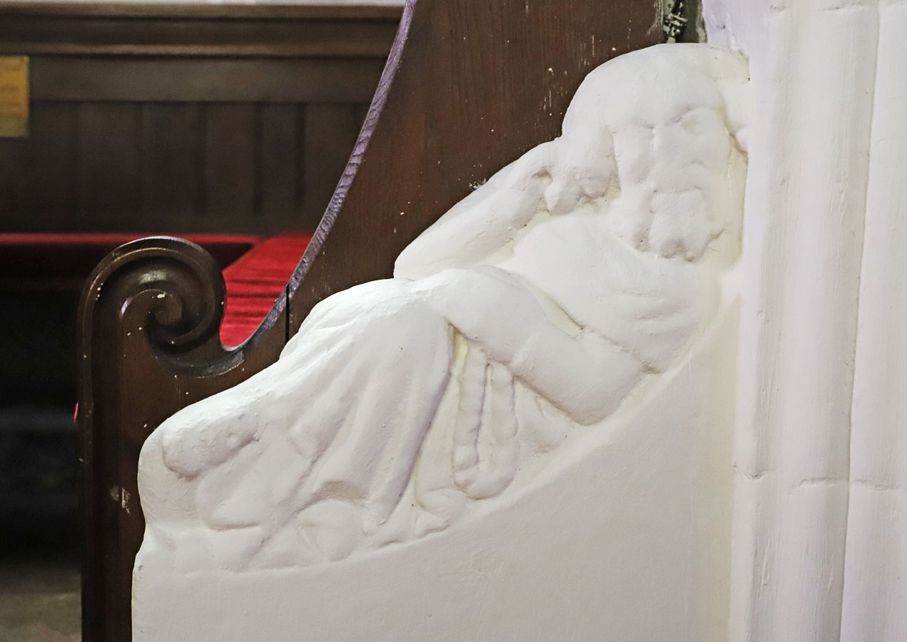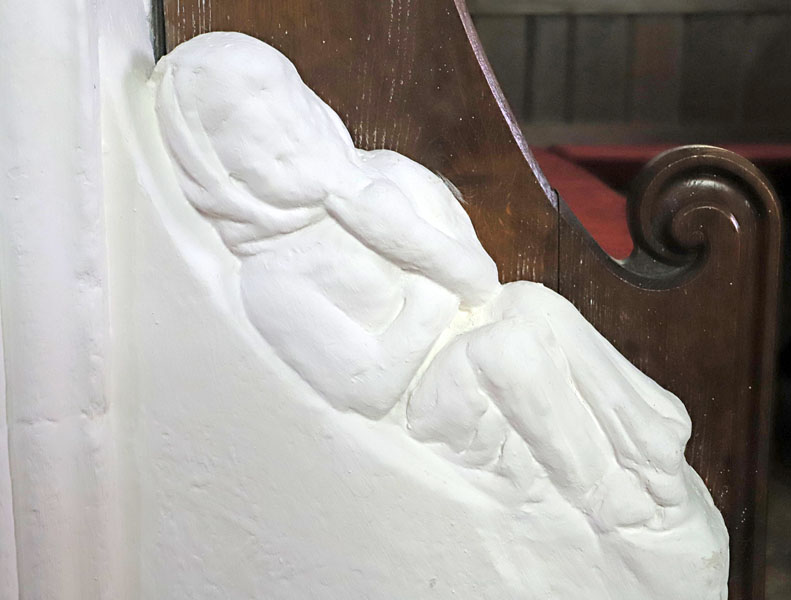St Leonard's Church, Sandridge, Hertfordshire. Sculpture of a recumbent monk or friar on the south side of the chancel doorway.