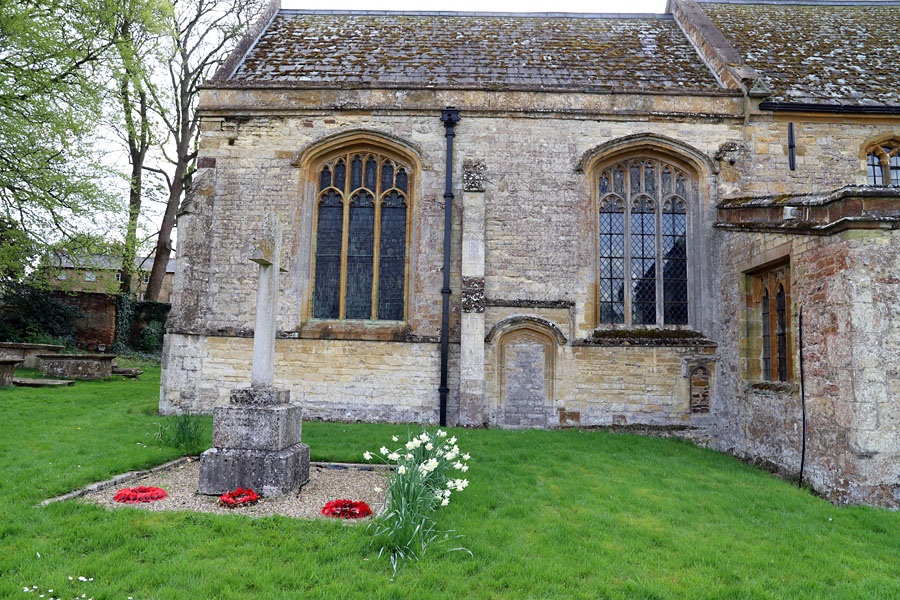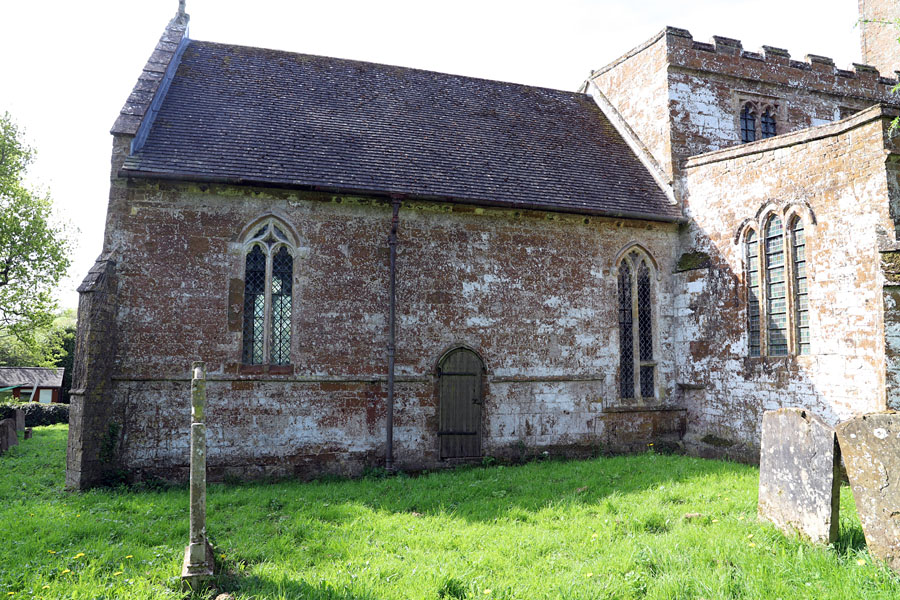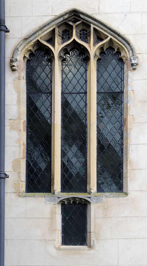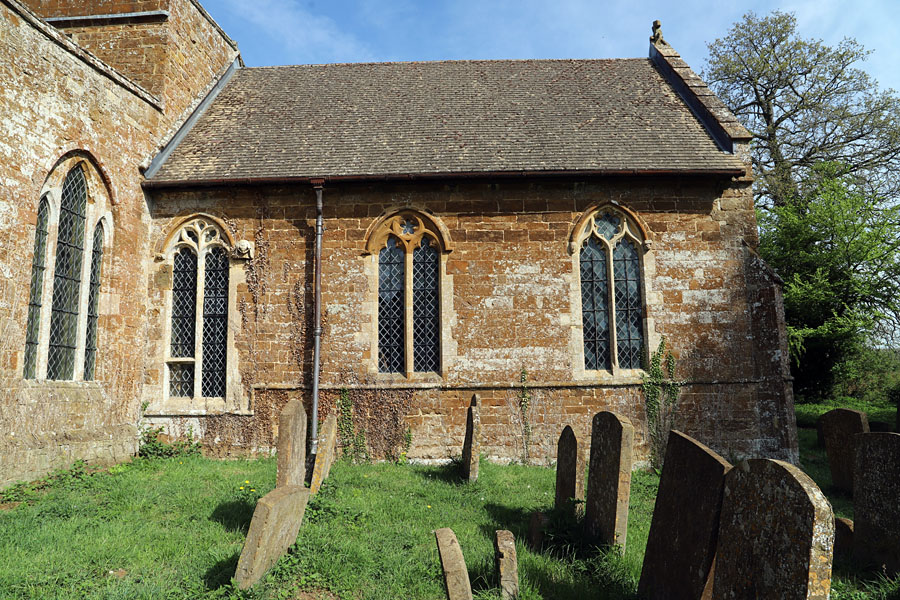 All Saints, Ladbroke, Warwickshire. On the north side of the chancel only the westernmost light has been extended lower by the addition of a transom. The building to the left housing a boiler is modern.