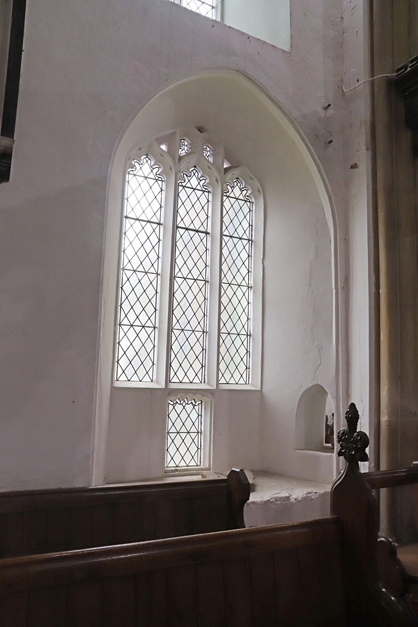 All Saints, Ladbroke, Warwickshire. Internally only the wall below the westernmost light has been lowered. The transom has clearly been restored, but the rebate for the wooden shutter can clearly be seen.