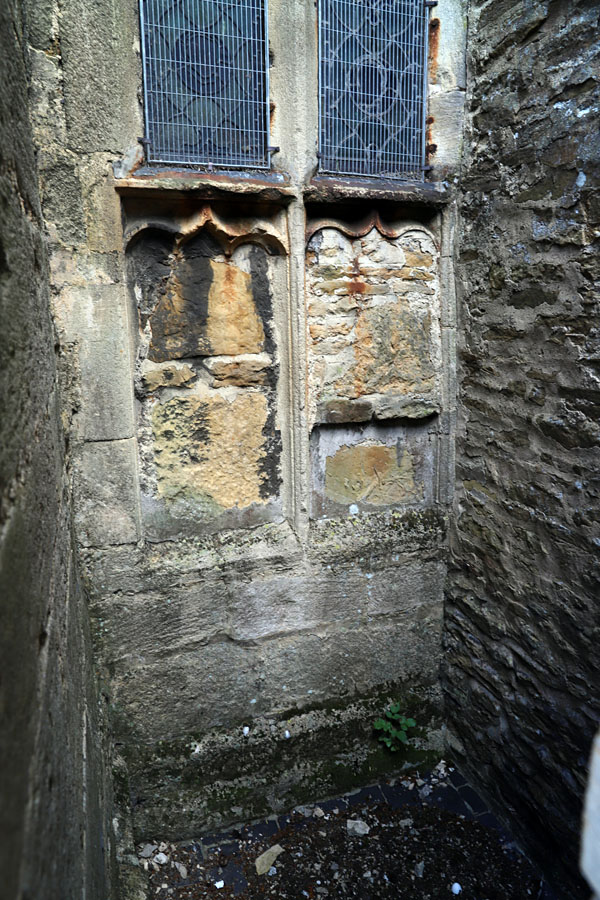 Here the whole of the two light windows in both the north and south walls of the chancel is lower than the other windows, and in both cases the westernmost light has been fitted with a transom to form a low square opening suitable for the placement of a wooden shutter.