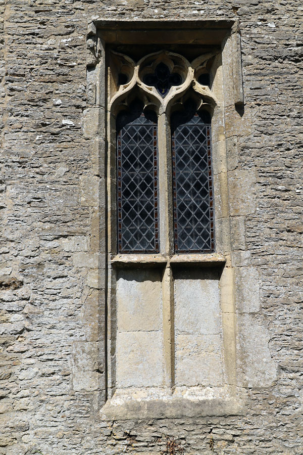 St Mary, Ardley, Oxfordshire. A two-light window in the south of the chancel has been lowered and provided with a transom and mullion (now blocked).